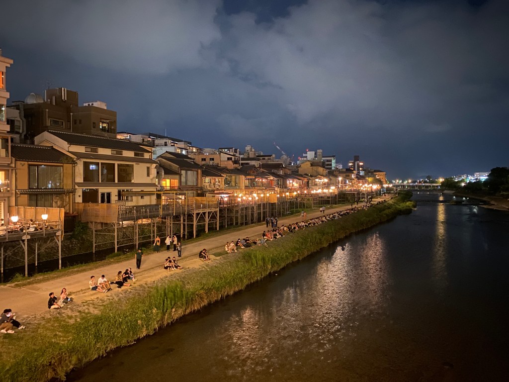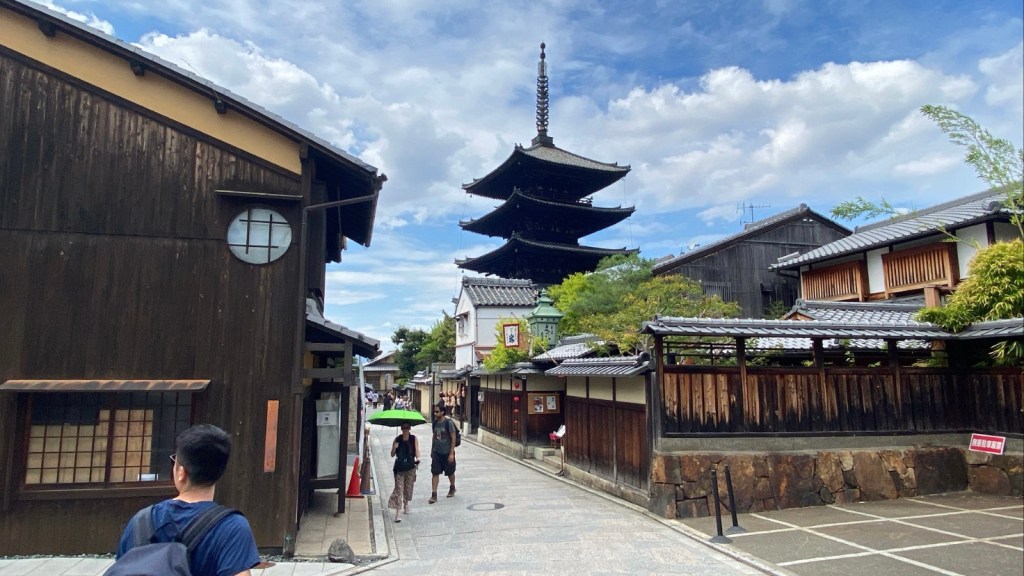 We quickly got our bags and belongings together before we came to a complete stop due to only having two or three minutes to get off at the station before the train barreled on to the next destination. The Kyoto rail station was certainly different from Tokyo’s and took us some time to get accustomed to. We finally found our exit and were glad to see that our hotel was only a block and a half away (bags each weigh at least 30-35 lbs each at this point and it starts wearing on you eventually, especially because David’s is tall with his day-pack zipped on and teeters around a bit, and Caitlyn’s is both broad and doesnt have any hip straps to help support the weight). It took no time to see how different Kyoto was from Tokyo. The streets were small, with less foot traffic, and a TON of bicycles. The people dress very differently than in Tokyo, seeming less focused on fashion and more conservative. We got to the hotel and were told that check-in was not until 3:00 pm and it was currently only 11:30 am. They did have an option to leave our bags behind a roped off section in the lobby. Knowing we couldn’t carry all of our stuff all day, so we grabbed our valuables and documents and left just our clothes and replaceable belongings locked in the bags in the lobby. We then set off to the southern Higashiyama area. After avoiding what felt like hundreds of bikes while making our way through the quaint streets, we crossed the beautiful Kamo river, taking in sights that simply do not exist in Tokyo. At this point we realized that we had not had a chance to use the restroom since leaving our hotel in the morning, and we had a few coffees and waters on the train, so we used the trick we had read about online: whenever you need a public restroom in Japan, find a Starbucks. Luckily for us, there is a famous Starbucks in the historical region of Gion that we headed towards. Instead of modern buildings, the streets were lines with authentic-seeming eastern architecture structures, where you can’t tell what is a home, shop, or temple. While we were glad to be in a short walking distance from the free restroom, it was ALL an uphill walk. We first struggled to find it, looking for a more classic Starbucks like you would see in the USA or Toyko, however this one was nestled in one of the eastern-style buildings as described above. It was absolutely packed with locals, tourists, and tons of people who had rented Geisha costumes for the day (extremely popular in this area of Kyoto). We didn’t intend on getting anything, however we did spot a unique Japanese-specific drink we had to try called the “Osatsu Butter” frappuccino. It had pieces of crispy waffle cone-like bits in it, which turned out to be fried sweet potato. It was a tasty reward after the 40+ minute uphill trek.