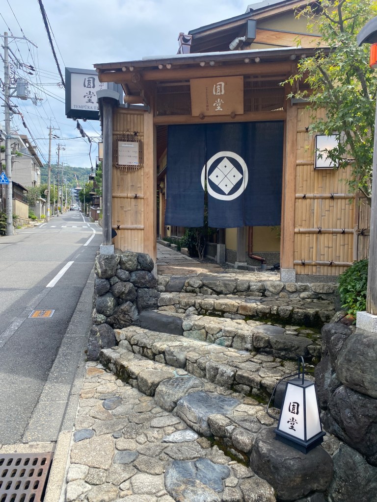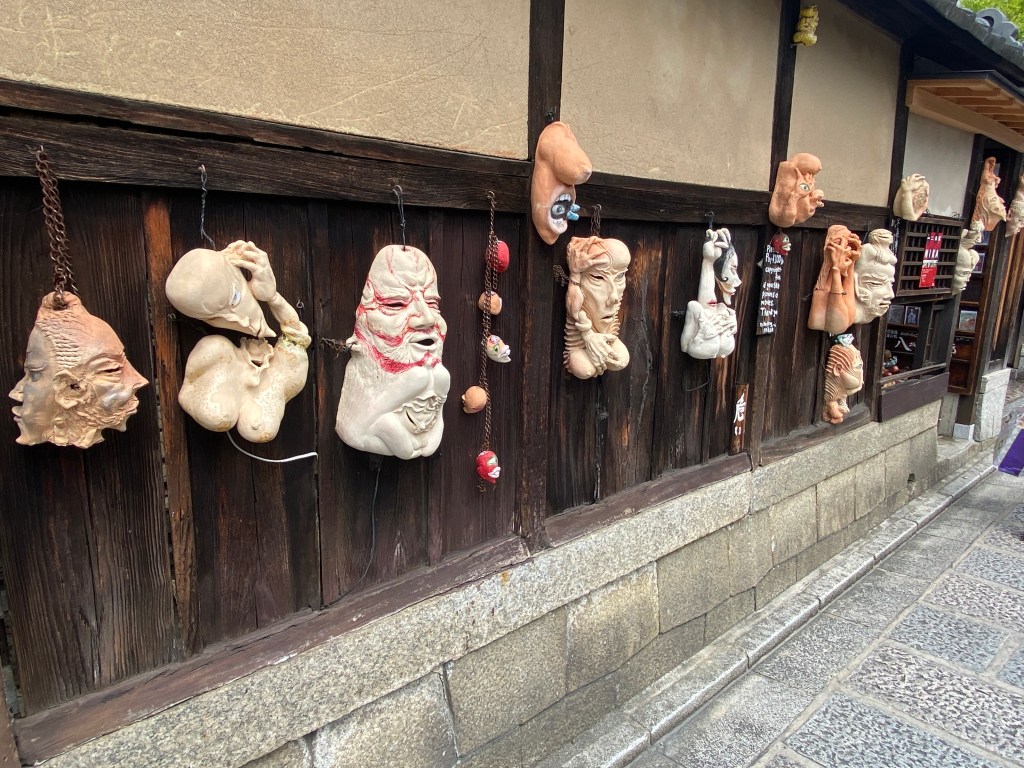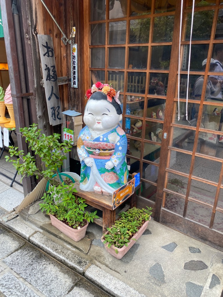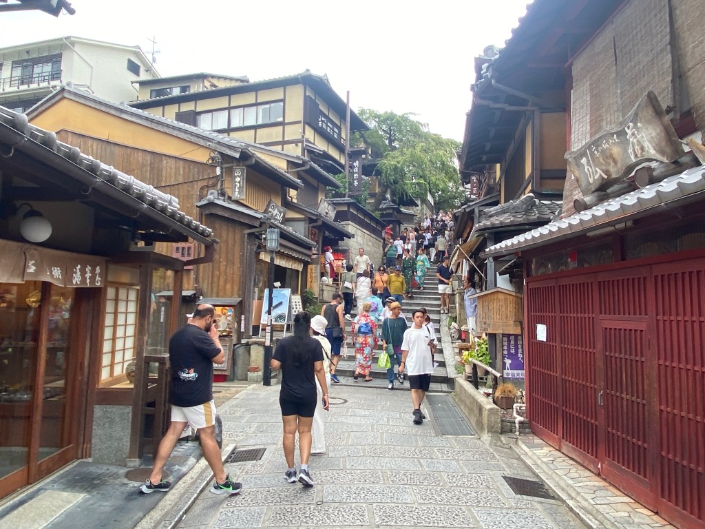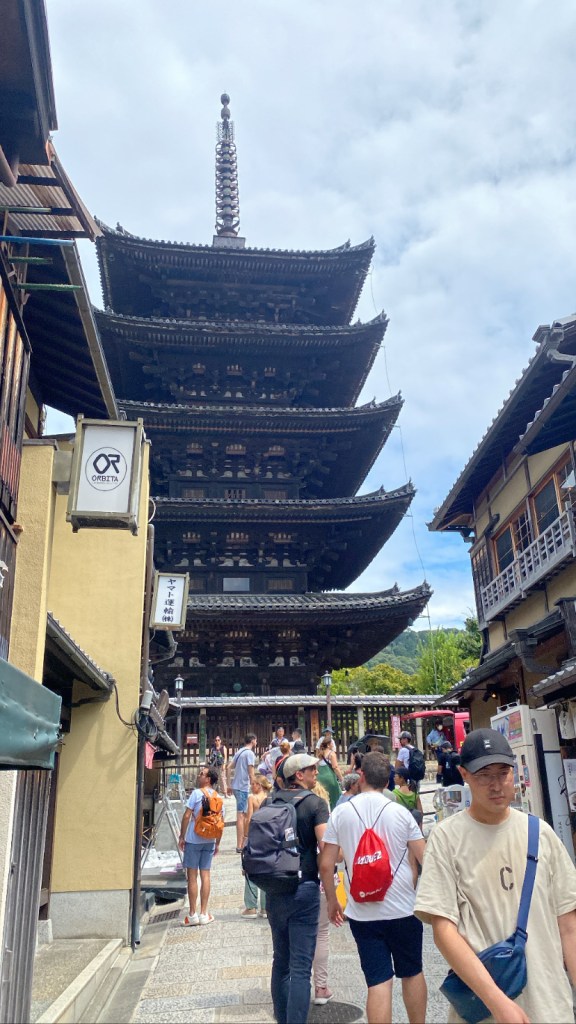 We headed back outside to explore the Nineizaka and Sanneizaka streets (the famous areas of Kyoto with the quaint buildings), stopping by almost every store along the way to browse souvenirs and Japanese foods. It was a blast, but it must be noted that it was PACKED with tourists both Japanese and foreign, making it difficult to walk more than a few feet without interrupting someone’s photo shoot. We walked past a highly rated traditional Kyoto restaurant that we decided to pop inside for lunch. They took us back to a private section for our table, requesting we remove our shoes before ducking behind a small curtain. The table was traditional, low to the ground with cushions to sit on. Thankfully, there was a recess under the table if you wanted to drop your legs instead of sitting on them or cross-legged, making it much more comfortable. They had a pitcher of ice cold water waiting for us, which was a first so far in Japan. We both opted to try the hot soba noodles in dashi broth, with Caitlyn ordering the Kamo soba (duck), and David ordering the Nishin soba (herring). The food came out quickly and looked incredible. We quickly dug in, but unfortunately it was not exactly to our liking. We appreciated the noodles and the duck slices, however, the dashi broth had a strong, coyingly sweet yet smoky flavor that was off-putting after more than a couple bites. The herring was incredibly pungent and reminded us almost of a preserved fish (and tasted just like canned herring you’d find in the USA). We can’t say that we enjoyed the meal, and unfortunately left without finishing much of our bowls (a big no-no in Japan, but we really did the best we could). We left in a hurry as to not be seen offending their food, however both getting up out of the traditional table and attempting to put our shoes on in a small hallway was challenging and probably drew even more attention to us.