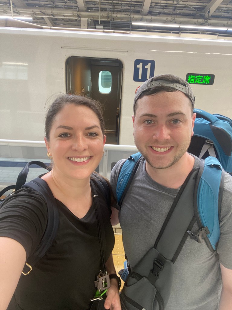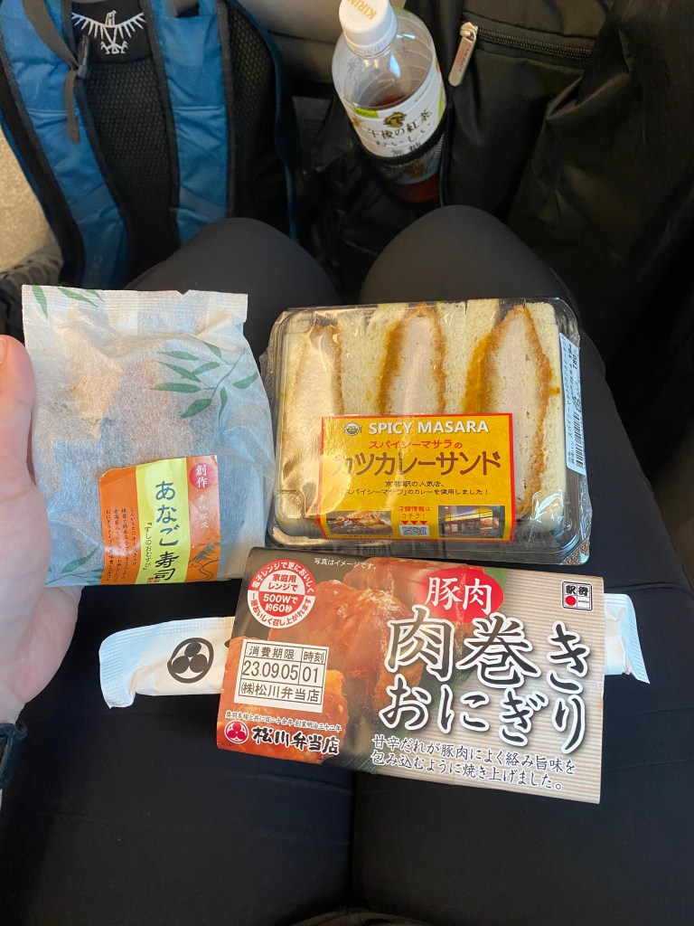 We settled in to some seats, and Caitlyn went off to check the stands for the famous bento boxes. It is highly recommended to purchase a bento box in the train station prior to boarding the train, and enjoying it along the ride. She found a small market that had an assortment of bento boxes, although most did not provide English translations, and google translate via lens was spotty. She opted for 3 smaller items for a DIY bento box, which included a chilled curried pork cutlet, an unagi onigiri, and some pork rice balls. Caitlyn even confirmed with the vendor via google translate that the items were to be consumed cold, which she figured would make for a great train brunch. Making her way back towards the sitting area with David, she confirmed with another train-goer of the location of the train, to which he confirmed we were at the correct platform, and we reunited. Minuted later, the same gentlemen that she spoke with came running up to Caitlyn to make sure we knew that while we were at the correct platform, our train had not arrived yet. This interaction summarizes Japanese culture so well, as they are so kind and polite to everyone. Our bullet train arrived around 9am, and we boarded to our right sided seats.