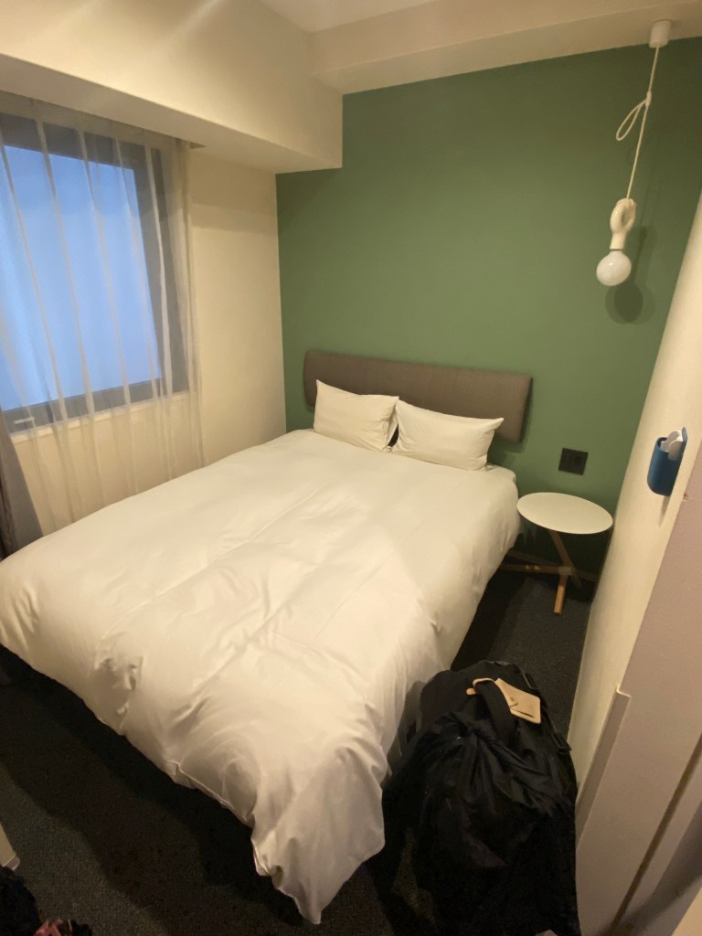 As 3:00 quickly approached, we decided to head back to the hotel to grab our bags and check in. Thankfully our bags were totally untouched (Japanese culture is extremely honest and polite. Shopkeepers will chase you down the street if you leave a single cent more than the price), and check-in was easy. We got to our room and instantly noted that it was smaller and had less of the highly coveted surfaces we have come to know and love. This room only had a small fold-out desk surface and one tiny bedside table. The bathroom was a little bit easier to navigate than the last place, which was a huge plus! Having been gone for about a week now, we were running low on clothes, which can only mean one thing: laundry day. Thankfully there are two washers and two dryers on the first floor, so we grabbed our dirty clothes bag and David went downstairs with some yen to start the laundry. We relaxed for 30 minutes while it ran, then tossed it in the dryer for another 30 and prepared for our evening. Unfortunately, the clothes were still soaked, so we split the load in two and ran it for another 30. Unfortunately unfortunately, they were still damp but we didn’t want to wait anymore, so we grabbed the clothes and got really creative in our room – taking advantage of every hook, bar, and hangable surface available to try to dry our clothes while we were gone.
