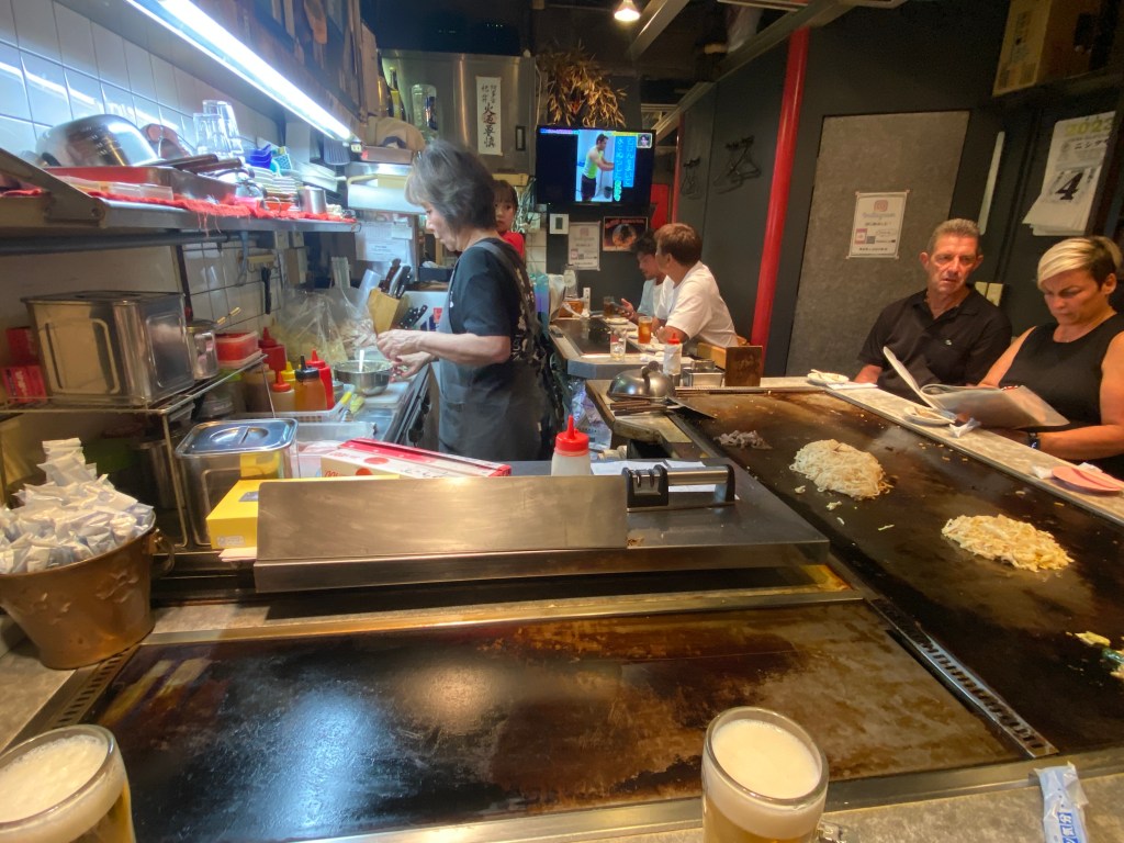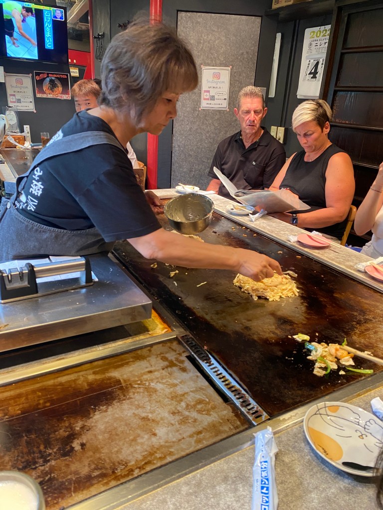 We set back off to head out down the main drag to explore the sights and sounds of Kyoto. We checked out tons of small streets, looking for anywhere to pop our heads into. Unfortunately, the area that we had wandered into was known for very expensive meals, so we had to backtrack to find a reasonable dinner. In wandering up one small street, we saw a tiny restaurant with a short line out front, highly rated, and known for its okonomiyaki (Japanese “pancake” made from vegetables, egg, batter, some oil, and assorted meats/seafood). Little did we realize that the shop only had 8 seats with only one older woman cooking absolutely everything to-order. The wait ended up being almost an hour, however we had already committed to this and stuck it out while in the heat with hot air blowing on us from the kitchens outlet. Additionally, two extremely rude Swiss people hopped in line behind us and encroached on our space, practically pushing us away so they they could lean on.a fence behind us, and chain smoking cigarettes without moving away from us. It should be known that no one in Japan smokes on the street and always goes to a designated smoking area, so this is doubly rude here. Finally, we were called into the restaurant for dinner. We entered the cramped yet cozy kitchen/dining room and were seated in the corner. Each seat had part of the teppanyaki cooktop right in front of them, on which your cooked meal was placed for you to cut and put on your plate. We o were pretty hungry at this point, and after waiting so long, we decided to order their two most recommended dishes: mixed okonomiyaki (meat and seafood) and mentaikoudon (an udon noodle dish). We sat with our mouths salivating as the chef (who looked like the picture of an older Japanese grandma) prepared dish after dish, conversing with all of the patrons about where they’re from and what languages they speak. Finally, she begun preparing our meal and we were progressively more intimidated as she added more and more and more to the pile of food simmering on the cooktop. To complete our dish, she asked if we wanted mayonnaise on top, informing us that all foreigners like mayo on the okonomiyaki. We decided to go with her recommendation, and a giant dollop of mayo was placed on top. She slide over the heaping piles of our two dishes and gave us a small spatula, and after watching other guests use it to cut the pancake before placing some on their plate, we followed suit. The okonomiyaki was about the size of a large dinner plate and about 2” thick. The noodles were just as plentiful and dusted with a beautiful red spice. We split the pancake and begun to dig in. We were less than halfway through when we both looked at each other and without even speaking, we knew that we were served FAR too much food. The menu had explicitly stated that we had to order one dish per person, but we had assumed that one dish would have been reasonable for one person and not an entire village. This was in stark contrast to the two Japanese men in the corner who seemed to be ordering dish after dish and never filling up. Towards the end, we decided that we just needed to eat as fast as possible to at least finish one full meal today and not insult our host. The noodles were nice, however forgettable for us. The okonomiyaki was far too heavy, greasy, and dense for us, especially with the mayonnaise, and was difficult to finish.