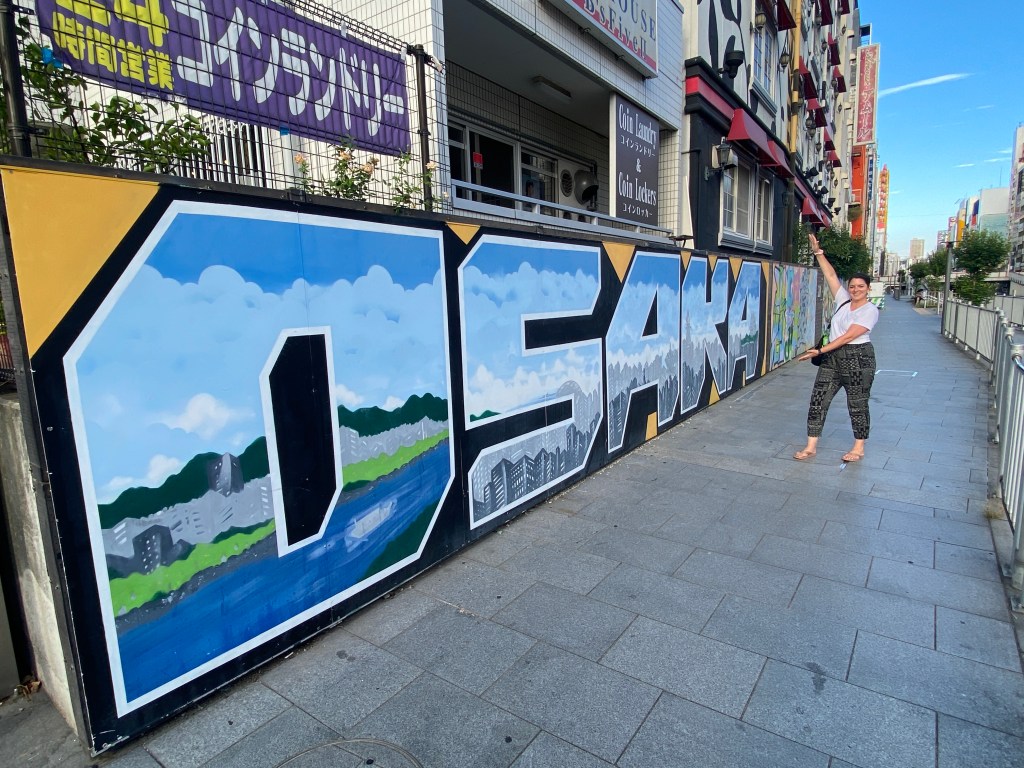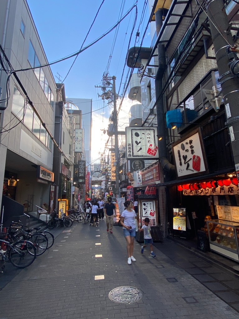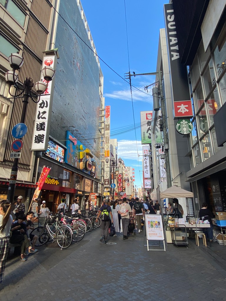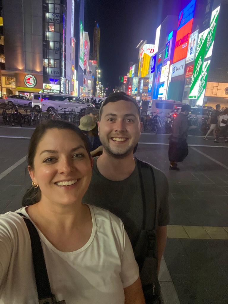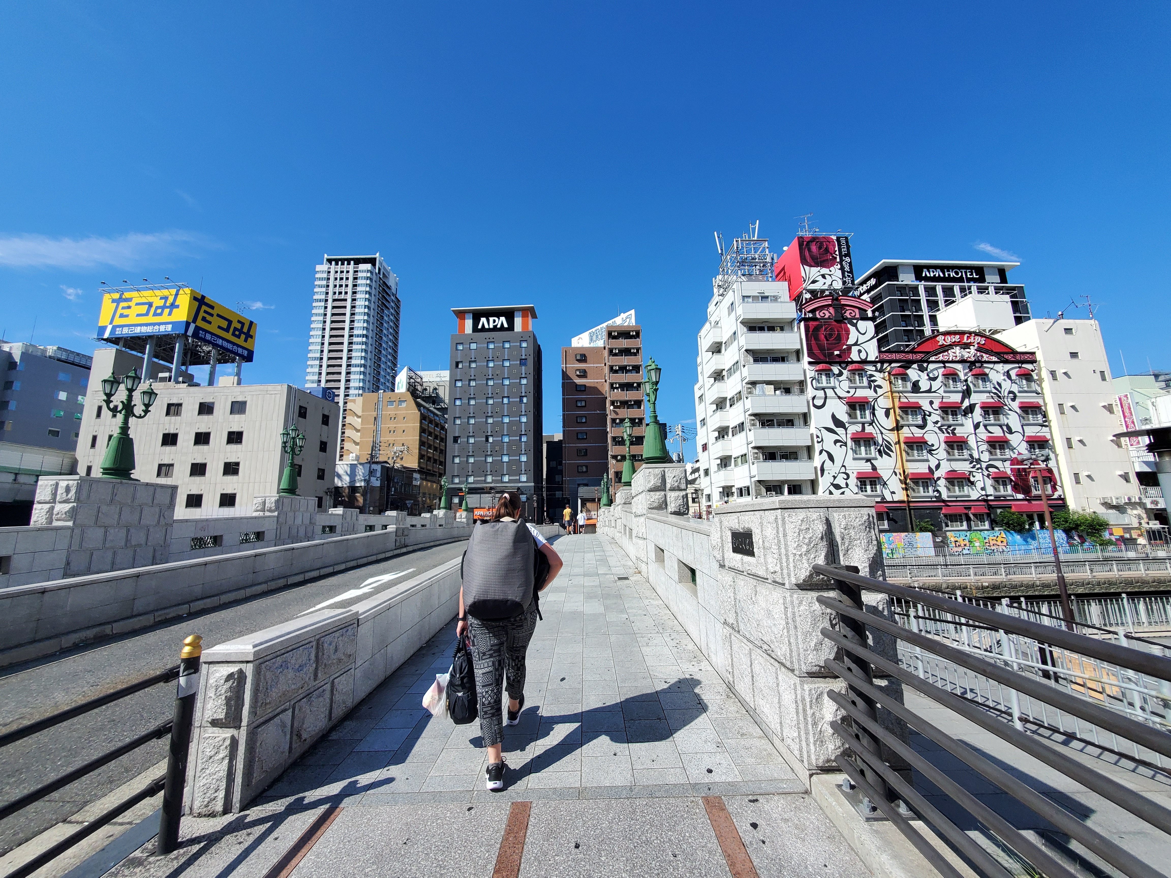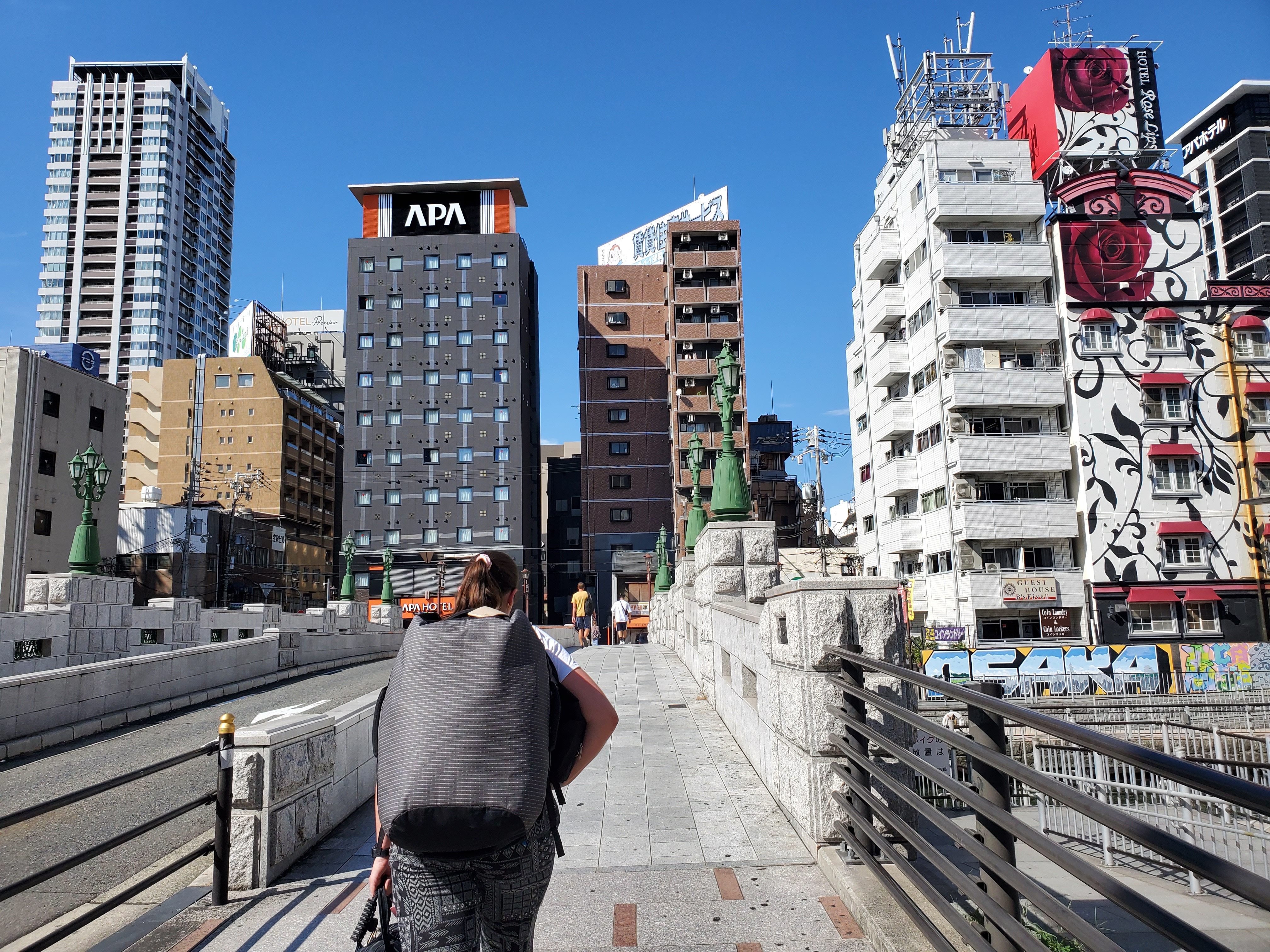 There is a quick 15 minute bullet train from Kyoto to Osaka, but for $20 USD less, we could take the regular train, adding less than 30 minutes in transit. We opted for this in lieu of the bullet train, and hopped on the local commuter rail to Osaka. We were lucky to grab seats next to each other, and continued our work on the blog. Before we knew it, the ~45 minute train ride was over. We navigated the station, a little confused (as is tradition in a new city). Thankfully, Caitlyn asked two elderly Japanese ladies for directions to our next station, and they wholeheartedly dragged us behind them, going out of their way and with big smiles on their faces, taking us all the way to the Osaka subway (NOT train), and giving us a big “goodbye!” Before turning around to go to their destination. We were so touched by their kindness in helping us navigate a confusing new transportation line. Getting off the subway at our destination station, we immediately felt like we were back in Tokyo. We were met with giant underground malls, fashion-forward young people, and bustling crowds. Eventually we found our stair access to the aboveground and felt even more like we were in Tokyo. Our first sight of Osaka included bright lights and billboards, skyscrapers, and really city traffic.