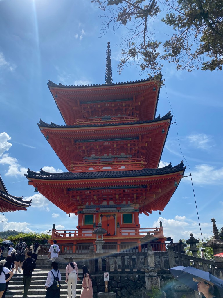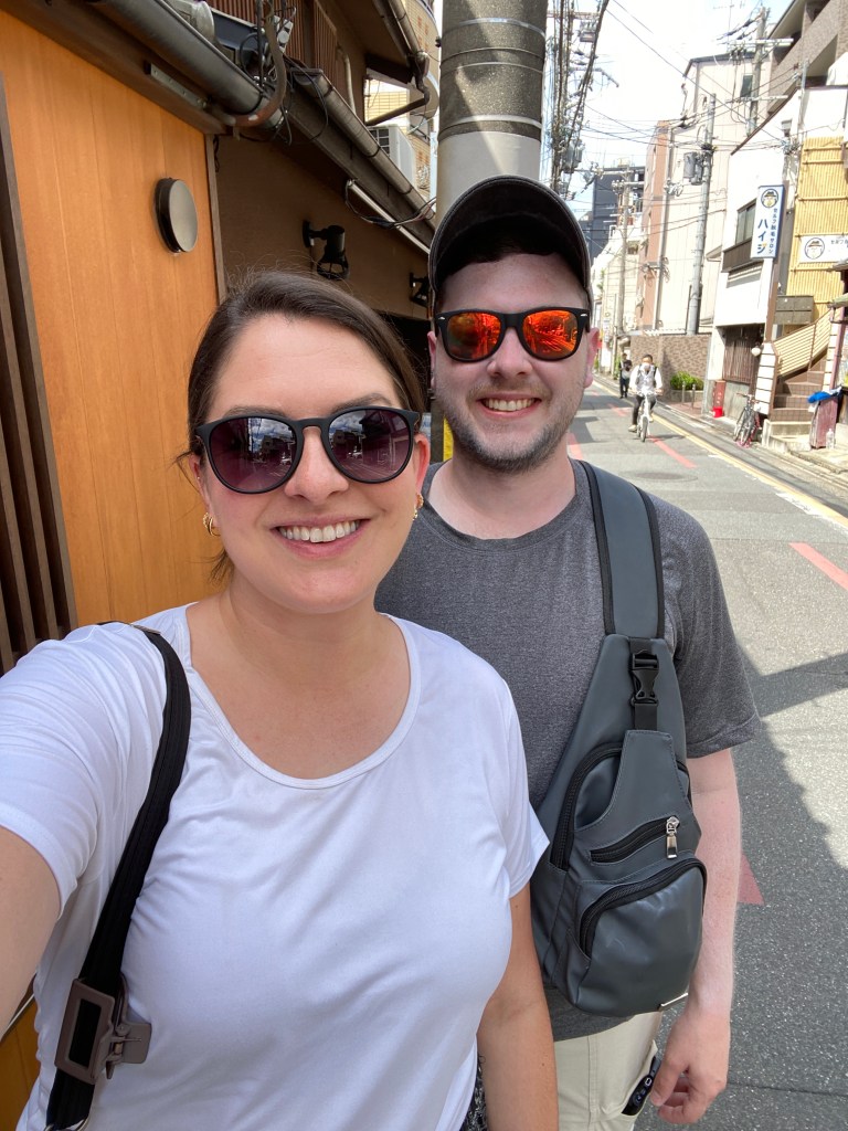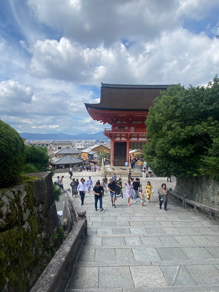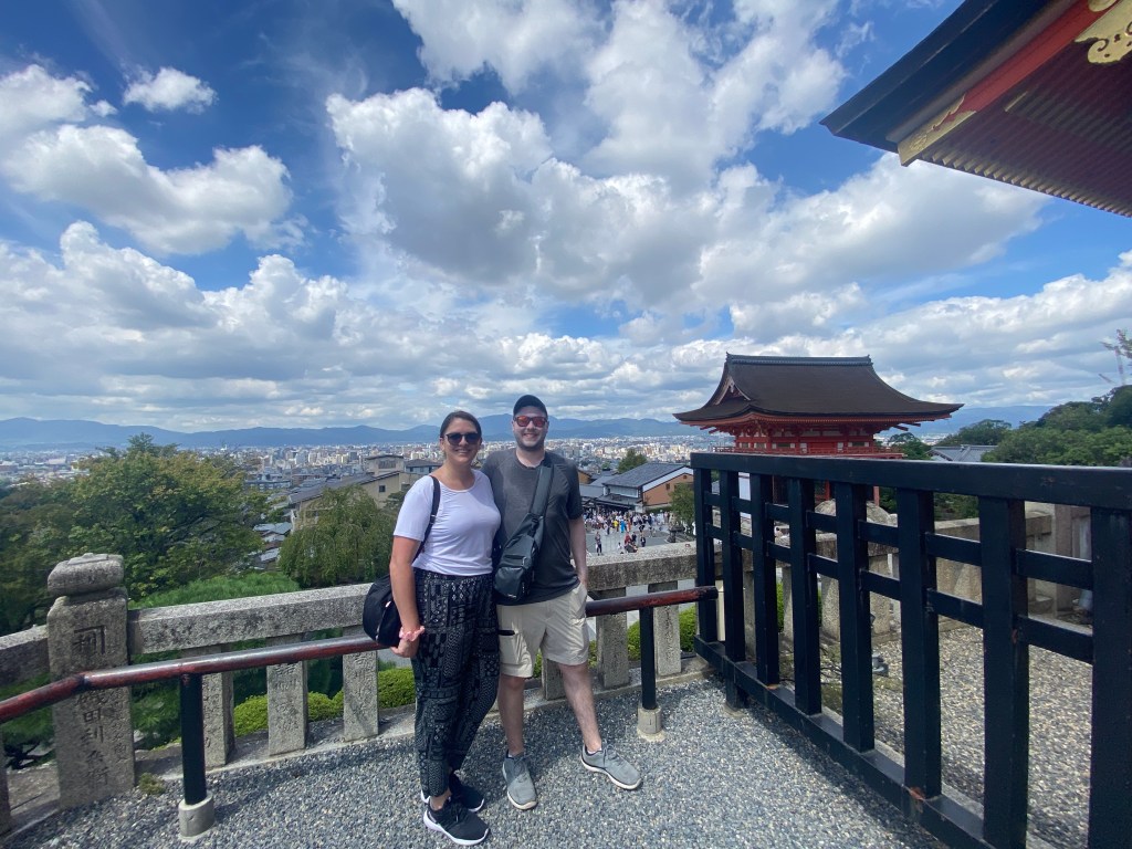 We continued on our way, up the progressively steeper uphill grade street towards Gion. It was EXTRAORDINARILY hot this morning, especially as we were already feeling the sunburns from the day prior settling in. 30 hot and sweaty minutes later, we made it to the start of the pedestrian region. This is where hell sank in. We realized quickly that it was a Saturday, and that the crowds were out of control. You couldn’t walk more than a couple feet without having a dress-up geisha cut you off while clogging her way across the street, or a family with a stroller stopping suddenly to admire some treats from afar. This is where “pedestrian road rage Caitlyn” turned on, and started barreling her way through the crowds to make it to the top. We probably shaved off a good 5 minutes from google’s predicted time, as she took no prisoners in her attempt to make it to the temple. Finally, we arrived! Caitlyn feeling accomplished, and David feeling dehydrated and sweaty. The temple was beautiful, as it sat atop a steep hill and overlooked all of Kyoto. We spent our morning taking in the views and beauty of Kiyomizu-dera.