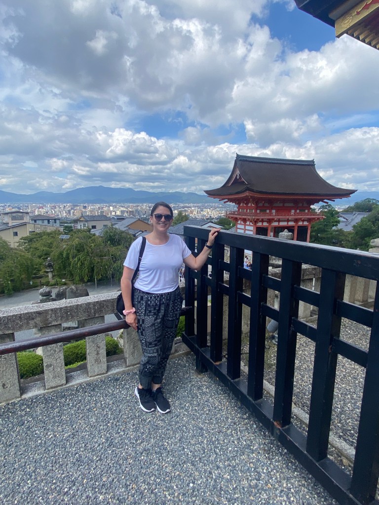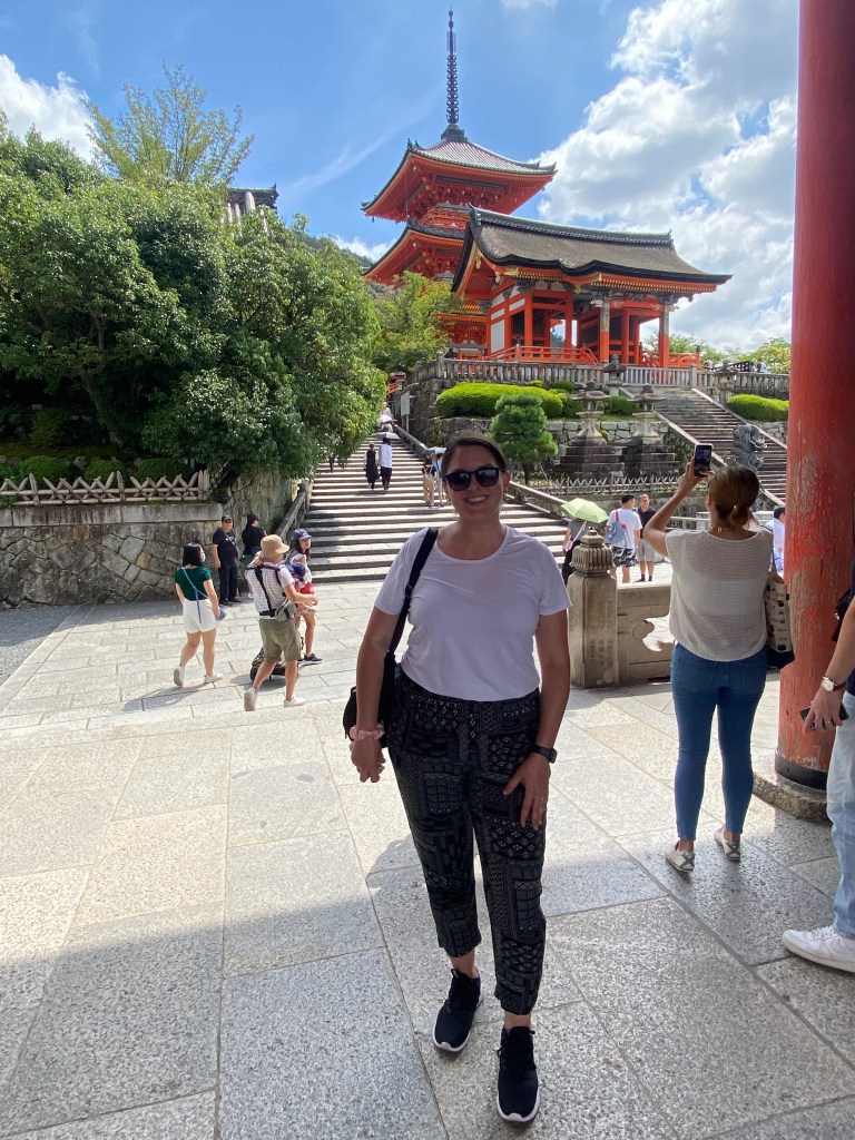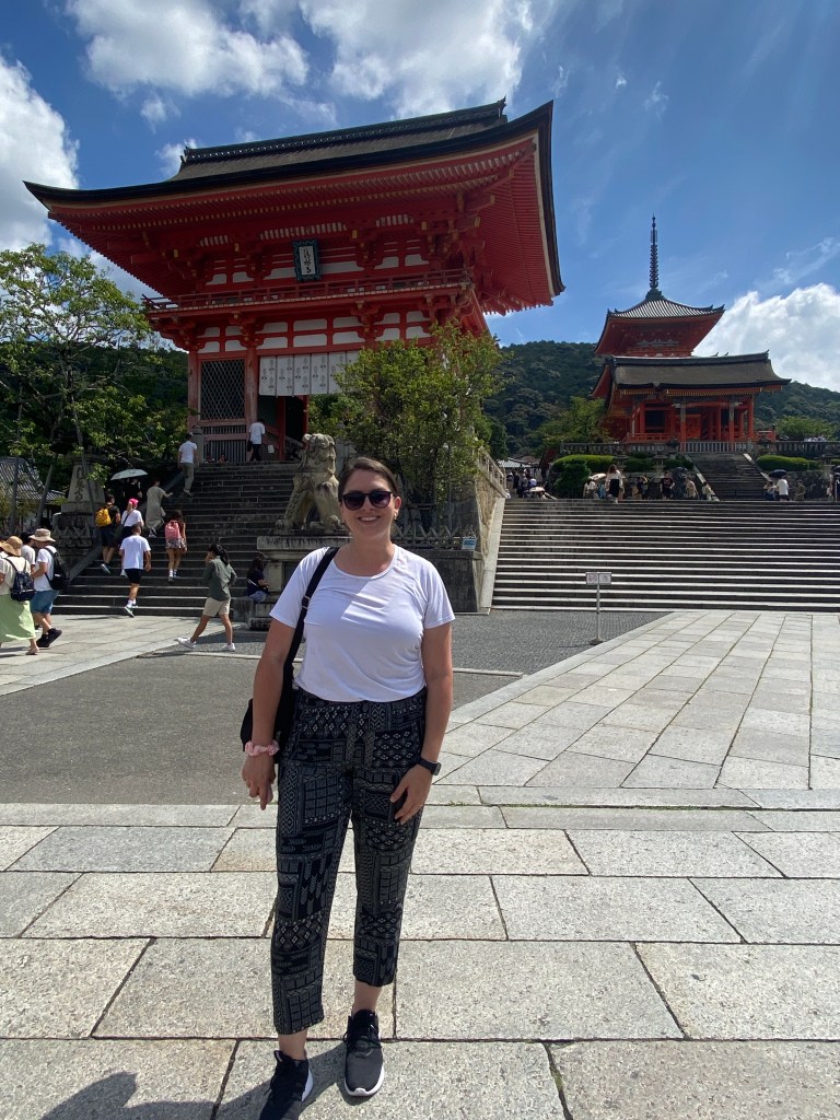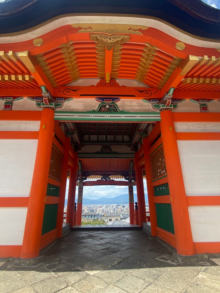 We continued on our way, up the progressively steeper uphill grade street towards Gion. It was EXTRAORDINARILY hot this morning, especially as we were already feeling the sunburns from the day prior settling in. 30 hot and sweaty minutes later, we made it to the start of the pedestrian region. This is where hell sank in. We realized quickly that it was a Saturday, and that the crowds were out of control. You couldn’t walk more than a couple feet without having a dress-up geisha cut you off while clogging her way across the street, or a family with a stroller stopping suddenly to admire some treats from afar. This is where “pedestrian road rage Caitlyn” turned on, and started barreling her way through the crowds to make it to the top. We probably shaved off a good 5 minutes from google’s predicted time, as she took no prisoners in her attempt to make it to the temple. Finally, we arrived! Caitlyn feeling accomplished, and David feeling dehydrated and sweaty. The temple was beautiful, as it sat atop a steep hill and overlooked all of Kyoto. We spent our morning taking in the views and beauty of Kiyomizu-dera.