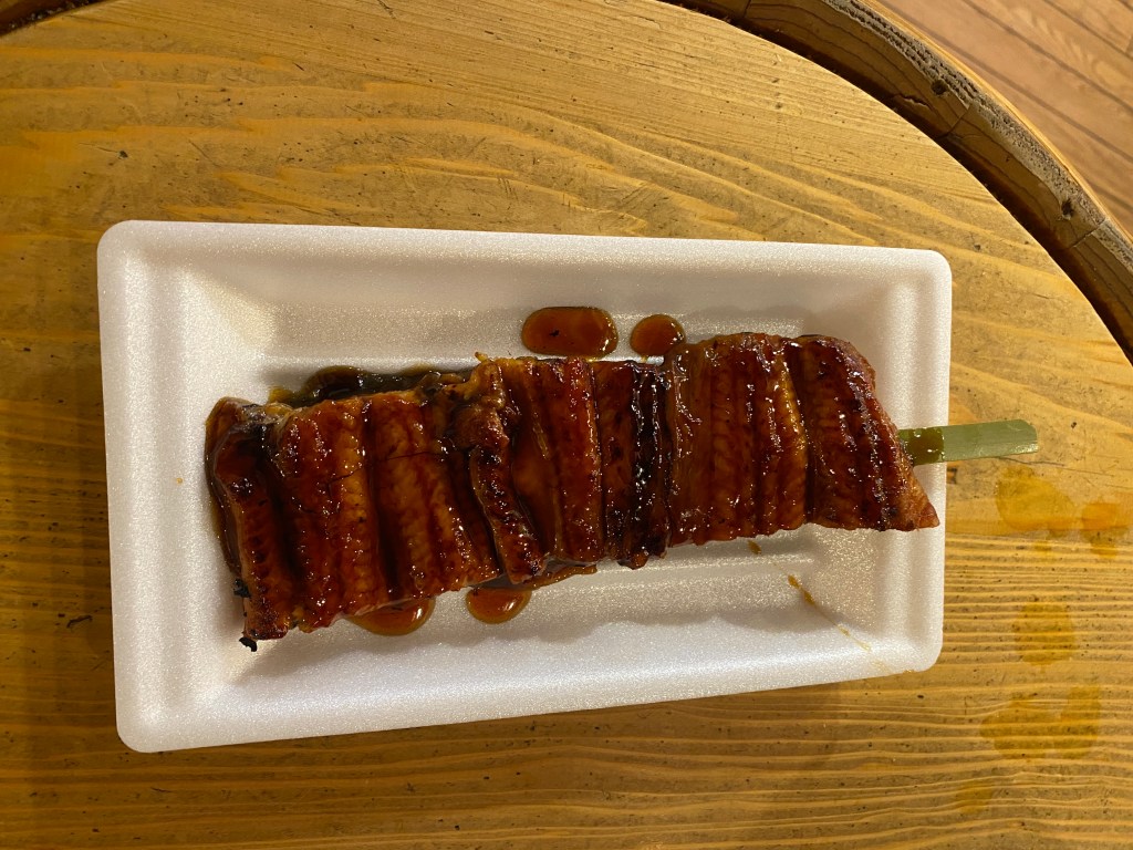 We walked the 30 minutes to the restaurant, arriving early at 11:50 for its 12:00 opening. What we didn’t realize is that people line up hours prior to put their name on a list for seating times. The hostess semi-laughed at us as we asked for a seat at noon, stating that they were booked up for the day. Oh well! We decided the the Nishiki Market would we the perfect last lunch meal in Kyoto before making the hour rail ride to Osaka. We had timed out our day to arrive in Osaka at 3pm, which is when our hotel check in time began, and to avoid having to store our luggage. Making our way to Nishiki market, we passed through some of the shopping streets we loved visiting. David was unfortunately feeling the effects of the heat, and needed both water and food. We bought a couple waters, which he quickly downed, and now it was time to find some food. Caitlyn had loved the squid on a stick that we tried previously, so we made our way back towards that vendor. While she ordered that, David settled on Unagi on a stick, which seemed to have a decent price tag. We stood at the communal eating area, and enjoyed both treats.