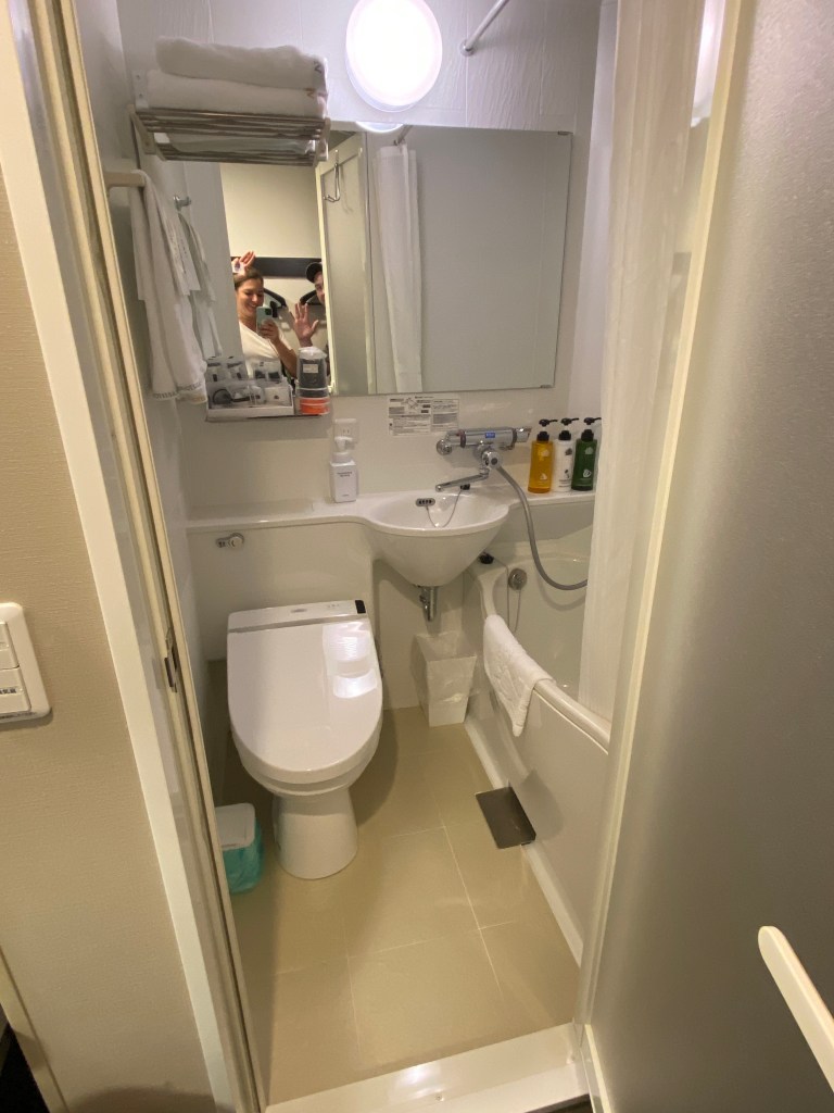 While we missed Kyoto already, it was a fun sight to see. We took a short walk to our hotel, noting that it keeps getting easier and easier to lug our ~35lb bags around each city-hop, despite the pervasive heatwave. We get to our hotel at 2:35 and drop our bags in the lobby, nursing our aching shoulders and backs. Caitlyn watches the bags while David walks up to check-in with Passports in hand (another APA hotel as in Tokyo, so we were familiar with their process). Unfortunately, they said they couldn’t check us in until 3:00pm on the dot. We sat on the floor of the lobby for 20 minutes until check-in, and headed up to our room. Opening the door, we were elated to see all of the APA comforts: a large desk to put stuff on (this is relation to Japanese standards; in the US it would be considered compact NYC loft-style) easy A/C and light access via a panel on the headboard, and the complementary bathroom supplies that we have grown to appreciate (and maybe hoard??? A fold-up brush? Packaged Q-tips? Disposable hand towels? Yes please, all back-packer’s essentials!).