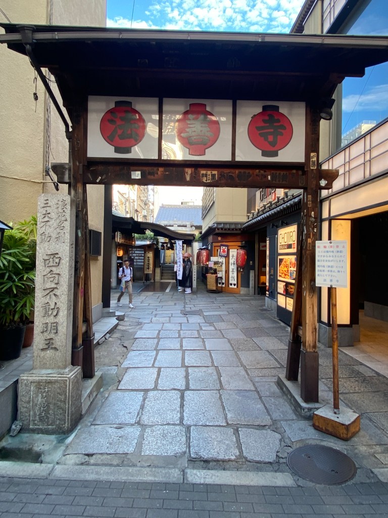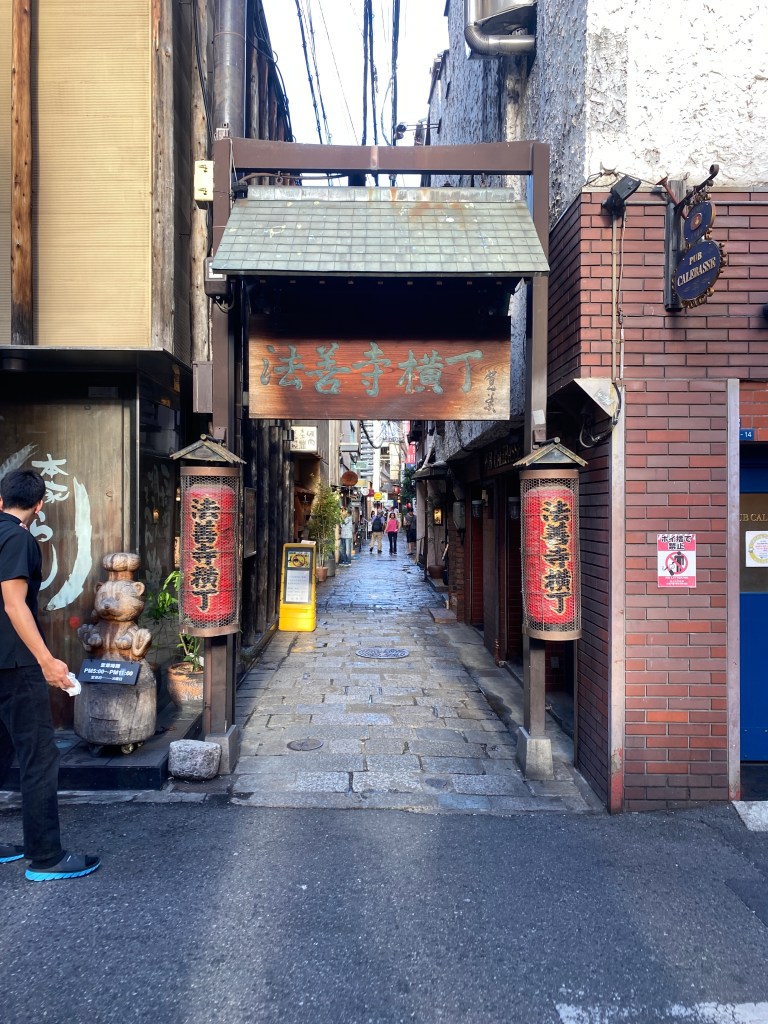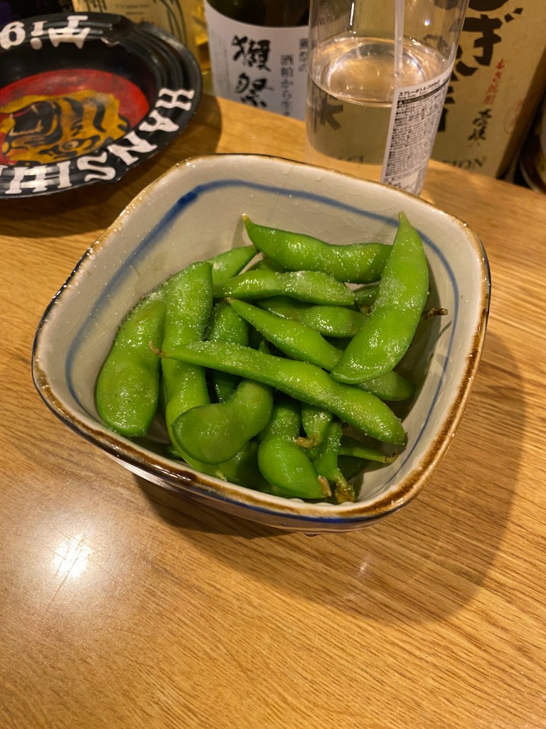 We went on our way to explore more of the side streets, and wandered past another baseball bar. Could this one live up to our beloved Kyoto eatery? We wandered up the stairs to see. We stepped into a small bar, with one communal table and 6 high tops at the counter. There was a game playing (Buffaloes vs. the Mariners) and 3 locals watching the game. It was clear that we stepped into a local watering hole, as they were all very curious to see us here, and the owner apologetically told us he had no English menus. No problem! We ordered a draft beer, and in checking out the google translate of the posted signage- we found pork belly to be on the menu. We asked about it, and we were told it was “Oden” which is a pot of mixed stew with fish, tofu, pork belly and more. He fished out a piece of pork belly the size of a saltine cracker and put it in a bowl for us with a small dollop of spicy mustard. Additionally, he pulled out a bowl of edamame, tossed some salt on it, and placed it in front of us. We sipped out beer, ate the pork belly and edamame (belly was tender with good flavor, although somewhat mild, but adding the mustard was too aggressive of a flavor) and tried to at least politely pretend to watch the game. More locals poured into the bar, giving us a double take each time. We finished our drinks, thanked the bar owner, and went on our way.