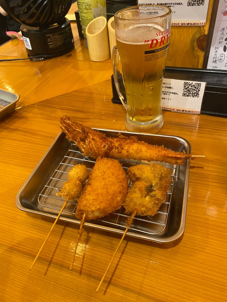 After walking around taking in some of the sights, and as 5pm hit, we decided to pop into an Izakaya for a beer and two skewers each (similar to Tokyo, many of the restaurants have either a seating charge or a minimum food order per person). David opted for the fried quail egg and Caitlyn opted for the fried onion, while mutually deciding on the shiitake and “big” shrimp. The food came out, and to our surprise, we realized that big shrimp meant a whole fried shrimp- head, legs, shell in all. David took the first bite, as the site of two eyes lightly fried was a bit of a turn-off for Caitlyn’s appetite. He convinced her to try the second bite, which she quickly regretted, as this bite had many of the legs/arms with a lot of shell that was difficult to get down. Once we were able to get to the meaty mid body region, we found the shrimp tasty and well cooked, however, it was challenging to get to that point. The quail egg was tasty, not super memorable, but something we would order again. The onion was like a better onion ring, without all the heavy greasiness and with a greater onion to breading ratio. The shiitake was great, with savory umami flavor, and our agreed favorite of the dishes. The mushroom, onion and shiitake skewers were a good price at ~$1 each, and the beers at $3