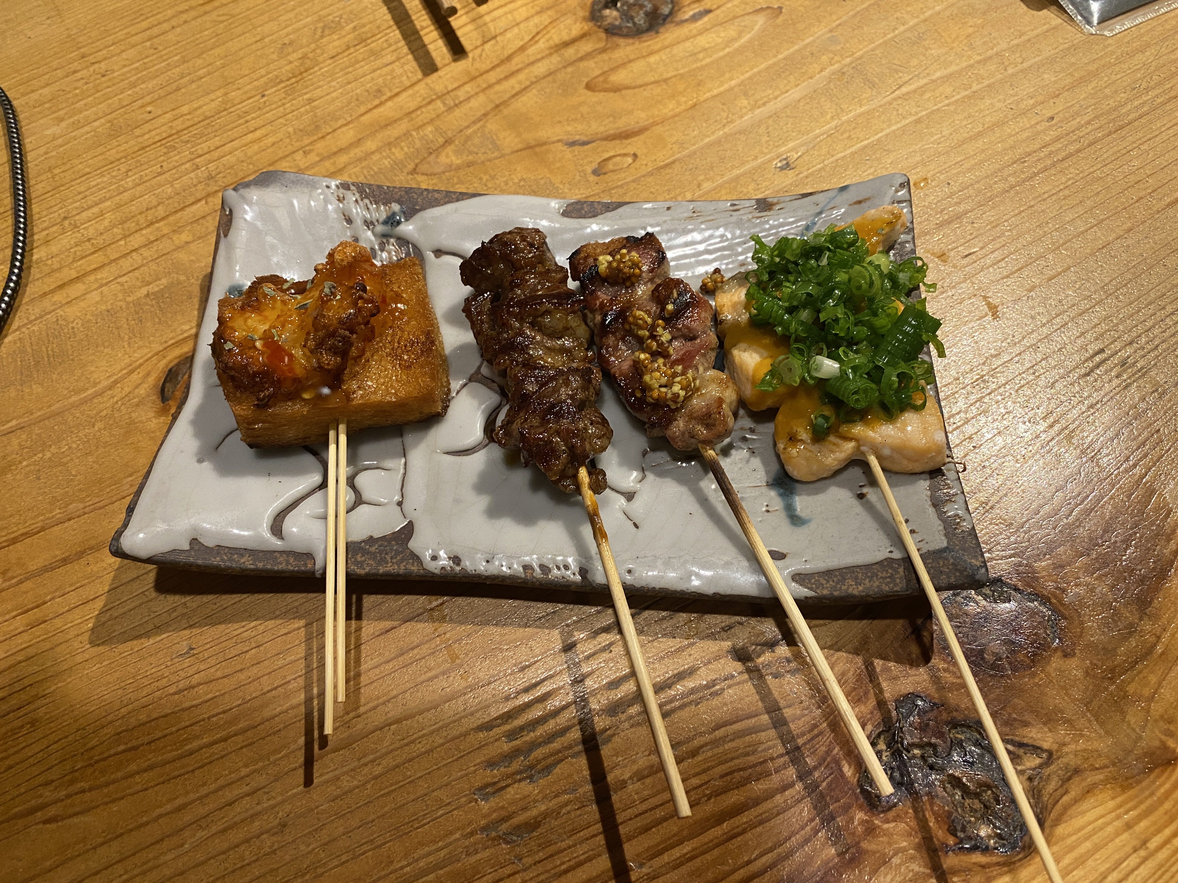 A few more streets explored, and we decided to end our night at a final Izakaya for a couple skewers. We found a highly rated modern Izakaya with decent prices, and stopped in. After a bit of back and forth with some broken English and google translate help, we were told that we could be seated now (8pm) but that they close at 9:30. No problem! We were seated upstairs and quickly greeted with a small assortment of appetizer samplers, including miso soup, a chilled chicken, and some milk tofu. The milk tofu was surprisingly delicious and had such a soft and creamy texture.