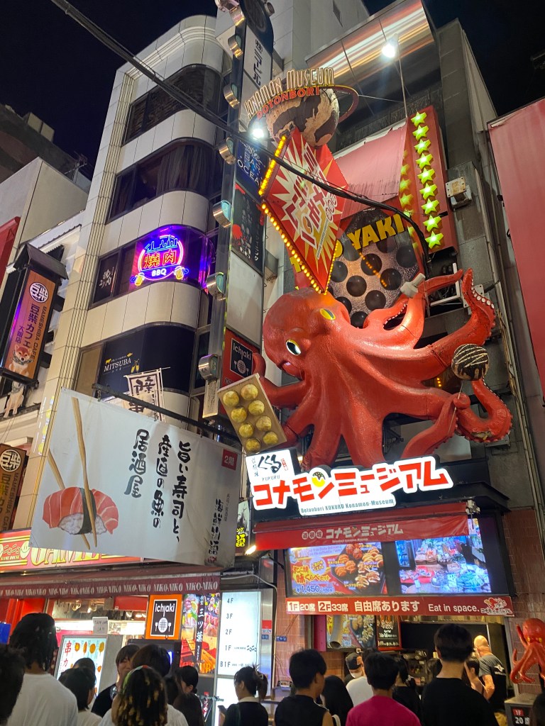 It was around now we really realized that Osaka seemed to be much younger and bigger on partying. Granted, it was a Saturday, but there were tons of rowdy groups of young 15-25 year old everywhere – walking and joking, sitting stooped on benches, drinking, and taking so many “candid” photos. We kept on walking and discovered why Osaka is the food capital of Japan. Street after street were lined with restaurants, with the smell permeating the dense city streets. Dozens of 3D signs and statues of crabs, takoyaki, steaks, and other foods hung above loads of restaurants. Employees stood in front of restaurants joking with potential customers and trying to usher people inside.