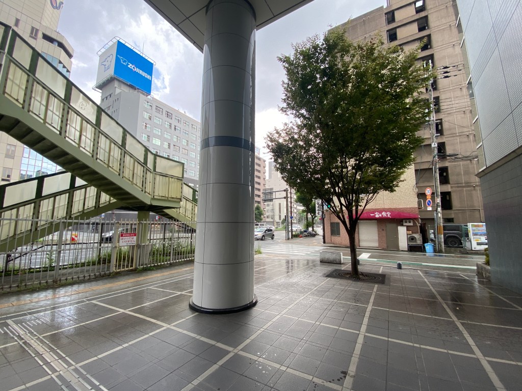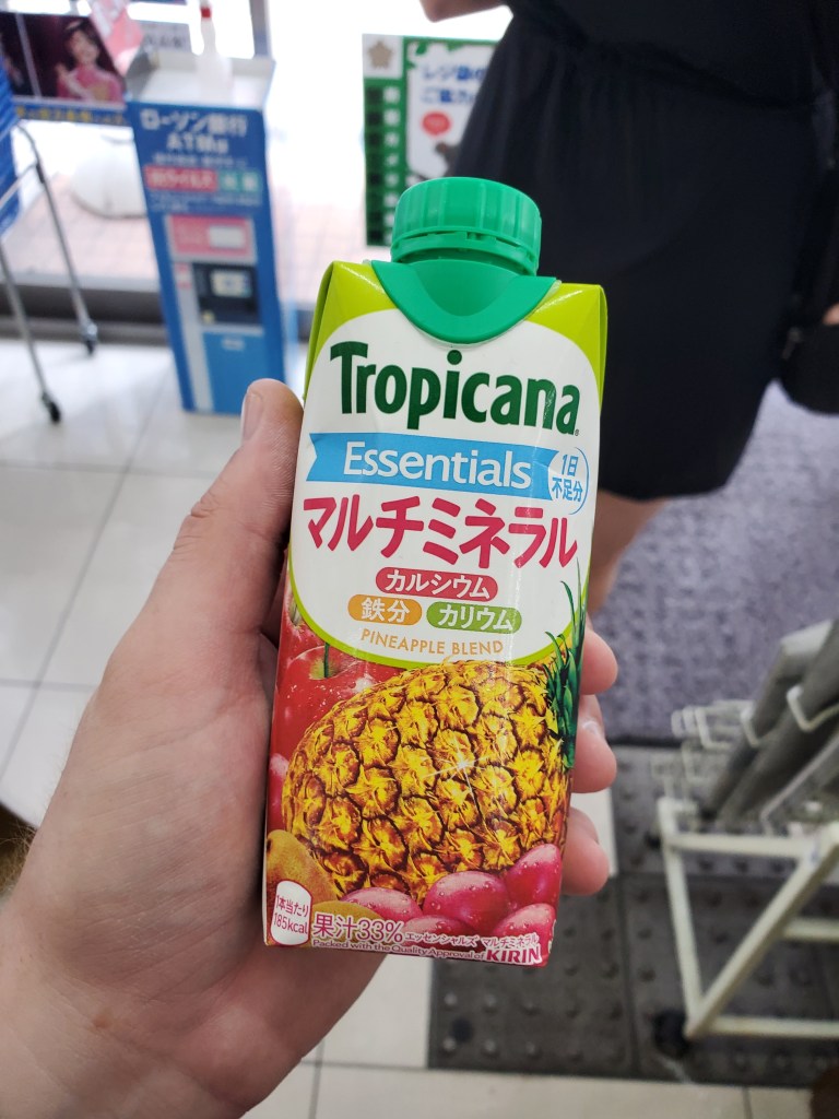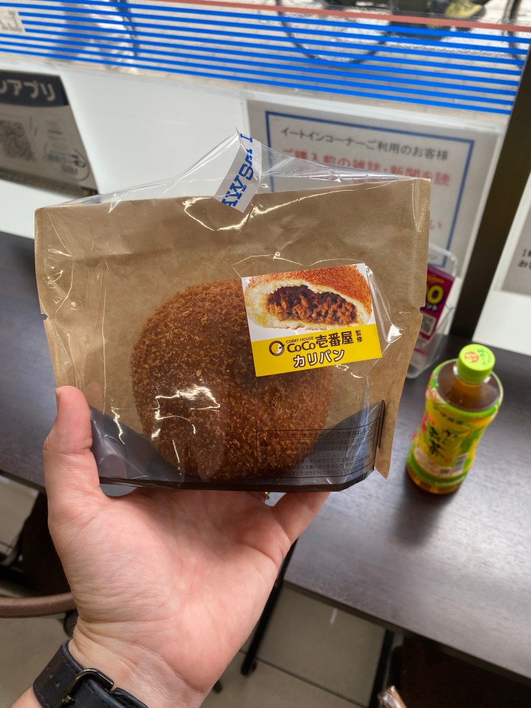Walking the streets, we found a highly rated ramen spot, but decided to skip it as we spotted the line of people waiting for entrance before we even saw the restaurant. Defeated and wanting to get on with our day, we stopped in a Lawsons (like family Mart or 711) and David grabbed a pineapple mixed fruit juice for a liquid breakfast, and caitlyn grabbed a curry bun. We sat at the counter and ate/drank our breakfast – the curry bun was very tasty with a light breaded exterior that seemed to be lightly fried, and a tasty curried center with a perfect stuffing to bread ratio. The fruit juice was standard, but did have a salty taste to it, almost like it had some Liquid IV in it. We also took this time to try and fix David’s umbrella, attempting to use the bear fan as a clamp to bend the nail that came out of the metal support rod. This was obviously completely unsuccessful, so we went on anyways, knowing that real rain was a few hours away and future David and Caitlyn’s problem.