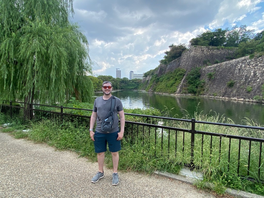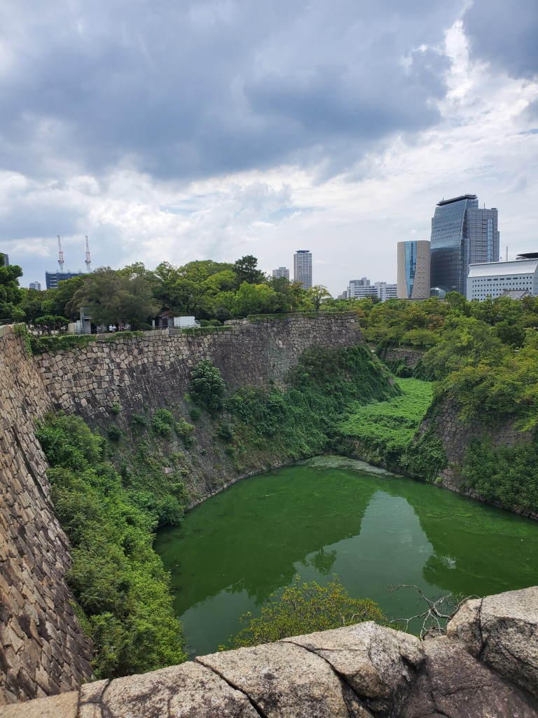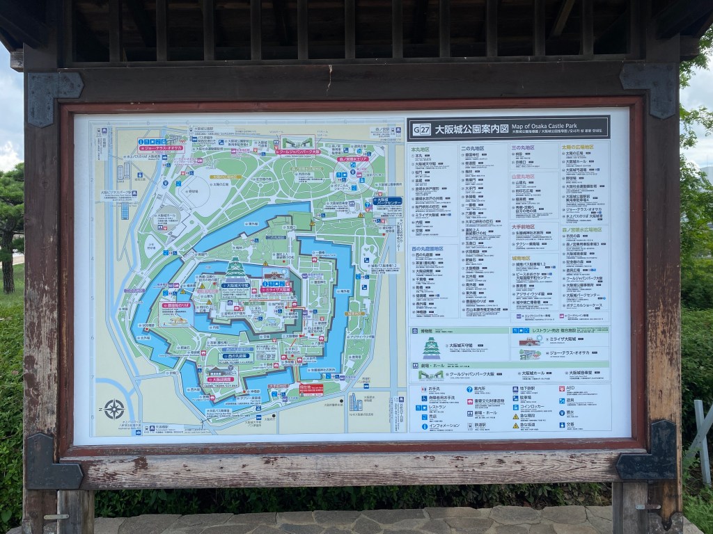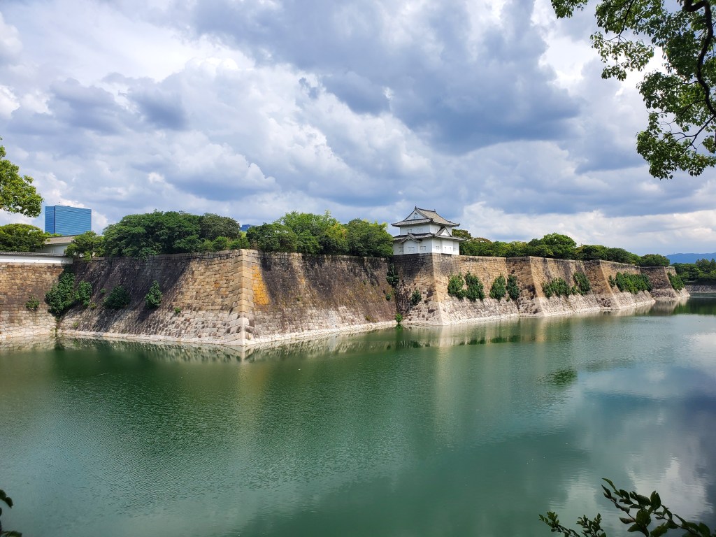 After conquering the central aspects of Osaka yesterday, today is the day we hit the north. Our first stop is Osaka Castle! We headed out and quickly felt how hot it was out today! The sun couldn’t make up its mind between showing itself in full or hiding behind the clouds, so we had our UV umbrellas at the ready to prevent any sunburn. The only problem is that the umbrella we purchased on the last night in Kyoto for David was defective – one of the metal support rods was busted. It still worked alright to block the sun in low wind conditions, but we were nervous that in any rain it would be a goner.