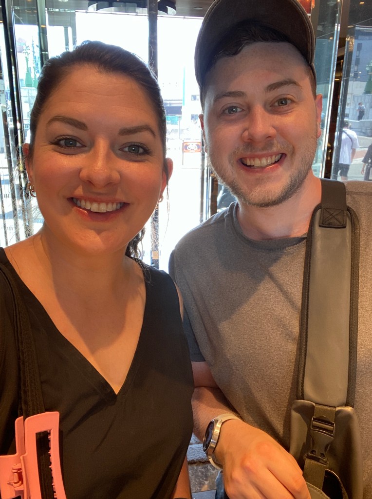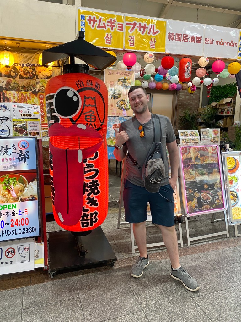 As we progressed along the walking mall, we tried stopping into another izakaya, but as soon as we walked through the door the woman took one look at us and made a cross with her hands stating “no room”. We thanked her and turned to walk out right as 3 younger Japanese guys walked in. We couldn’t help but notice that they put up 3 fingers indicating the number of people in their party, and were directed to a table. This was the first time we experienced something other than extreme kindness and hospitality from the Japanese people. We tried to shake it off, and found another local watering hole to hit instead. As we entered here, we were met with frustrated looks from the waitress who reluctantly showed us to a counter seat. When we asked for a menu or how to order, she was quick to say “no no” and move on. Attempting google translate with her was out of the question, as she was unwilling to attempt the transaction. We decided it would be best to just leave. Having two poor experiences in a row in this part of Osaka left a bad taste in our mouth, and we decided that it would be best to head back towards our hotel region. Along the way, David found a woman selling umbrellas and picked up a new one! She was quite the saleswoman, and showed off all of the features of the umbrella, including how to open it and close it in a way that would rival Vanna White. Funny enough, it was the most basic umbrella, and an explanation was not exactly needed (but we were glad to confirm that this umbrella didn’t come broken). We made our way back to the start of the mall and hopped on the rail to head home.