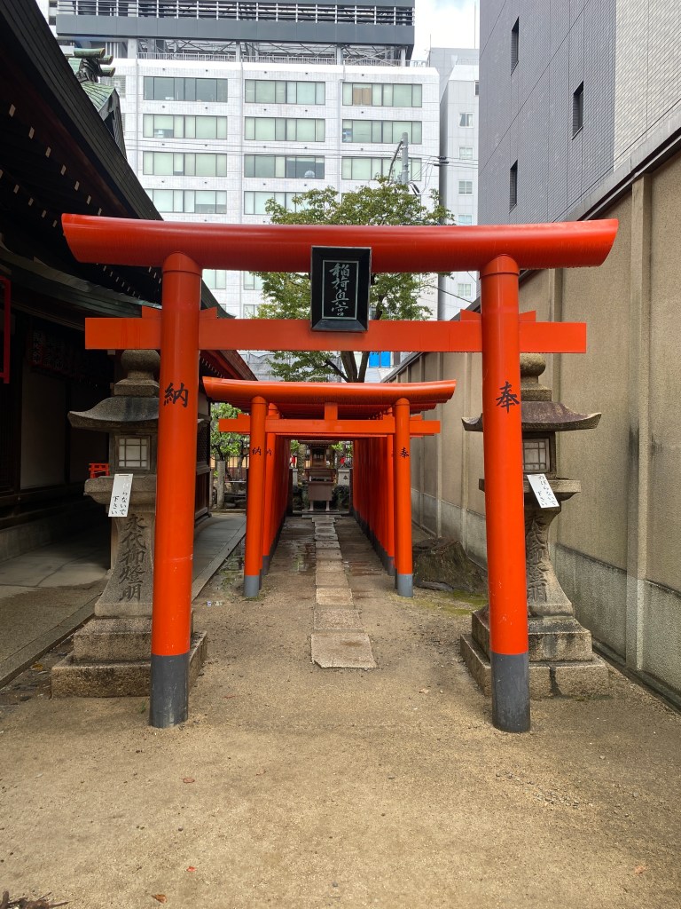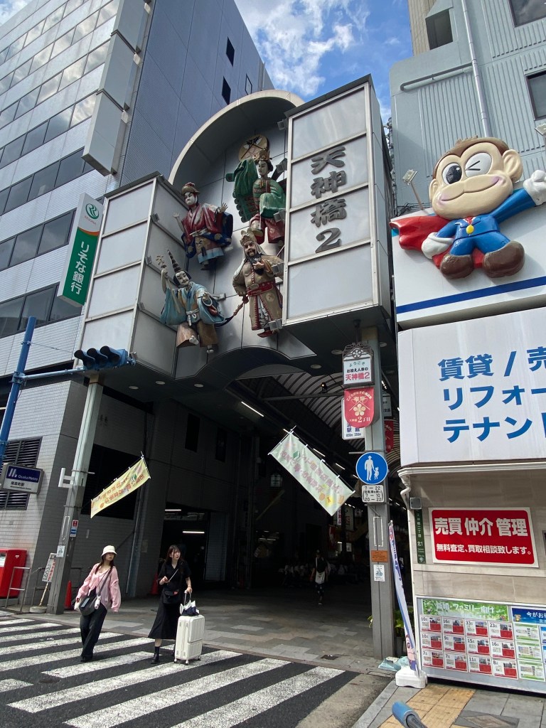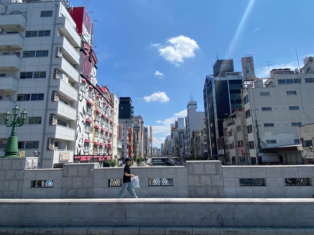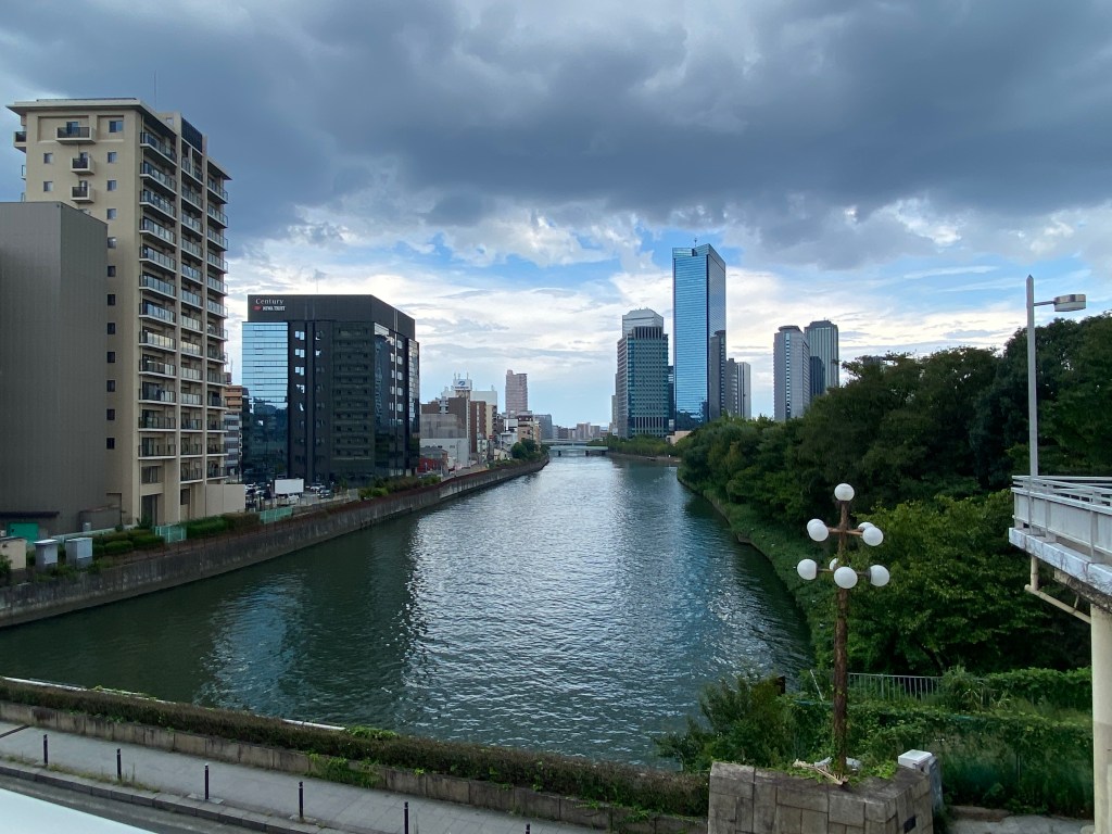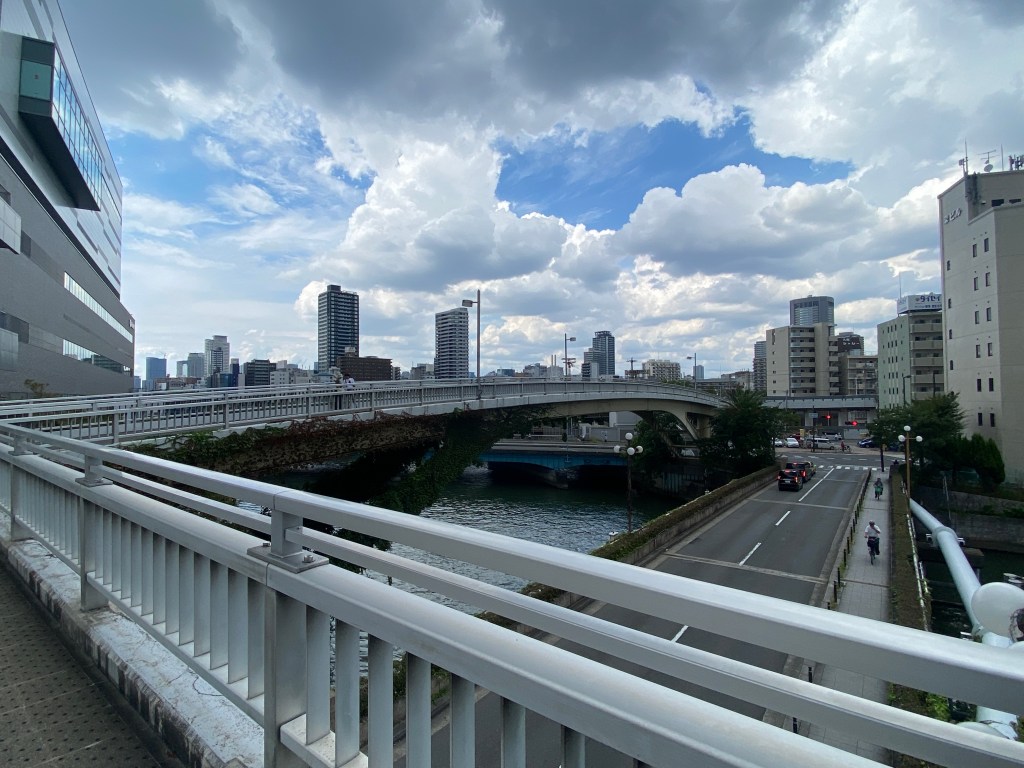 We then made our walk towards our next destination, Osaka Tenmangu – a Shinto shrine. The skies began to darken in an ominous manner, making David very nervous about the integrity of his already broken umbrella. Along the way we crossed over several pedestrian bridges, which offered more beautiful views of the city.