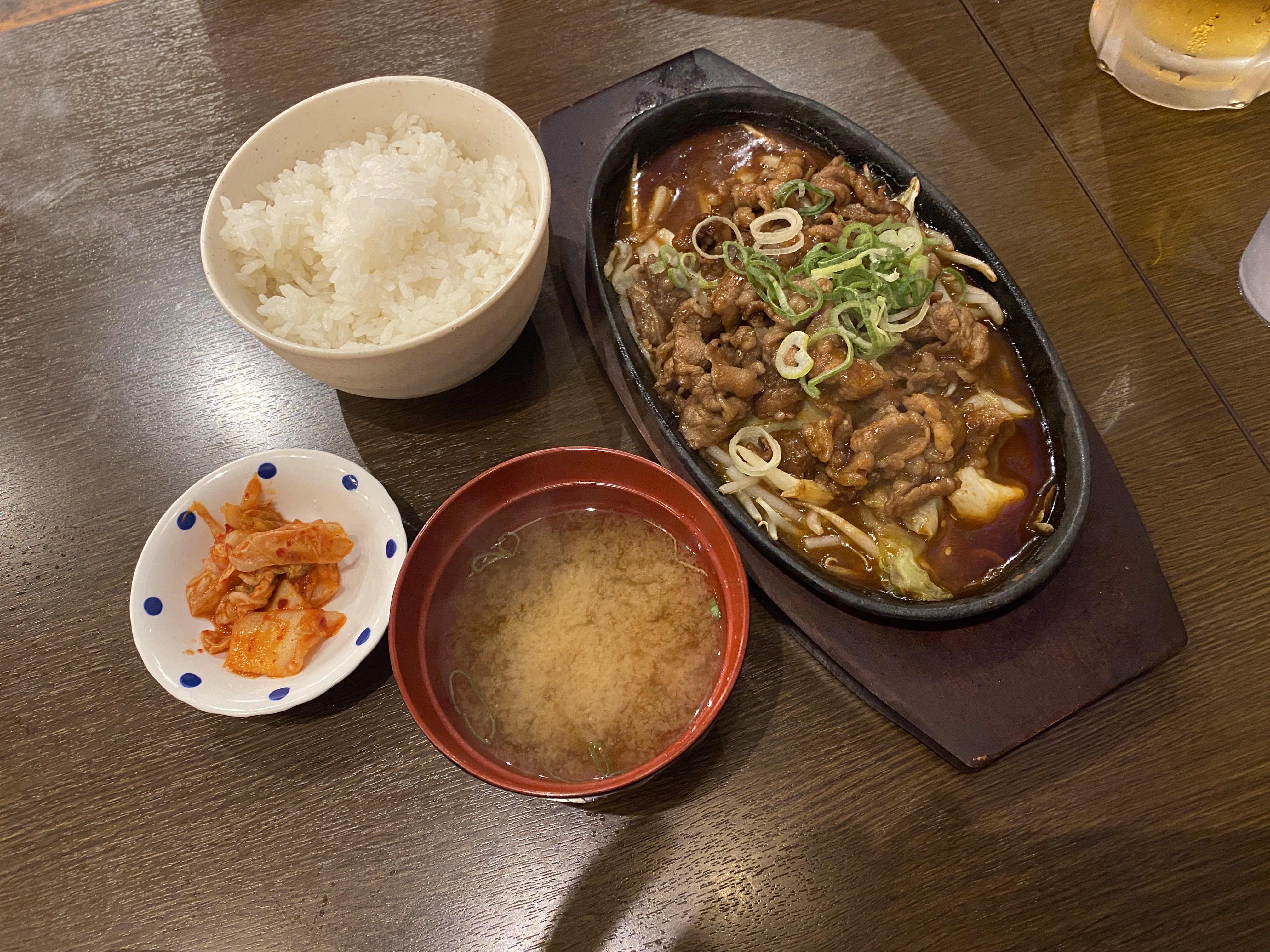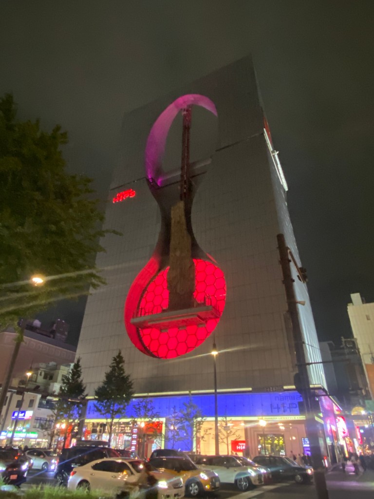 It was at this point that we realized it was already after 2, and we hadn’t eaten any lunch. We passed by a yakiniku restaurant, and the high rating and alluring smell drew us in. Lucky for us, Wi-Fi was also available, so we popped out our iPad to work on our blog. Additionally, we happened to be there during happy hour! David grabbed a “mega pint” while Caitlyn ordered a sour (her new favorite in Japan! We think it is soju and soda, but tastes like a carbonated lemonade with some alcohol in it. Lemon is by far the most popular flavor, but many places have dozens of flavor options). We decided to share the short rib combo, which came with thinly sliced beef simmered in a soy-based sauce, rice, miso soup, and kimchi. The short rib was amazing, with such an addicting flavorful sauce along with tasty cabbage and bean sprouts. The miso soup was also very good, and the kimchi was tasty. We ate slowly, taking our time to get our blog published from two days prior.