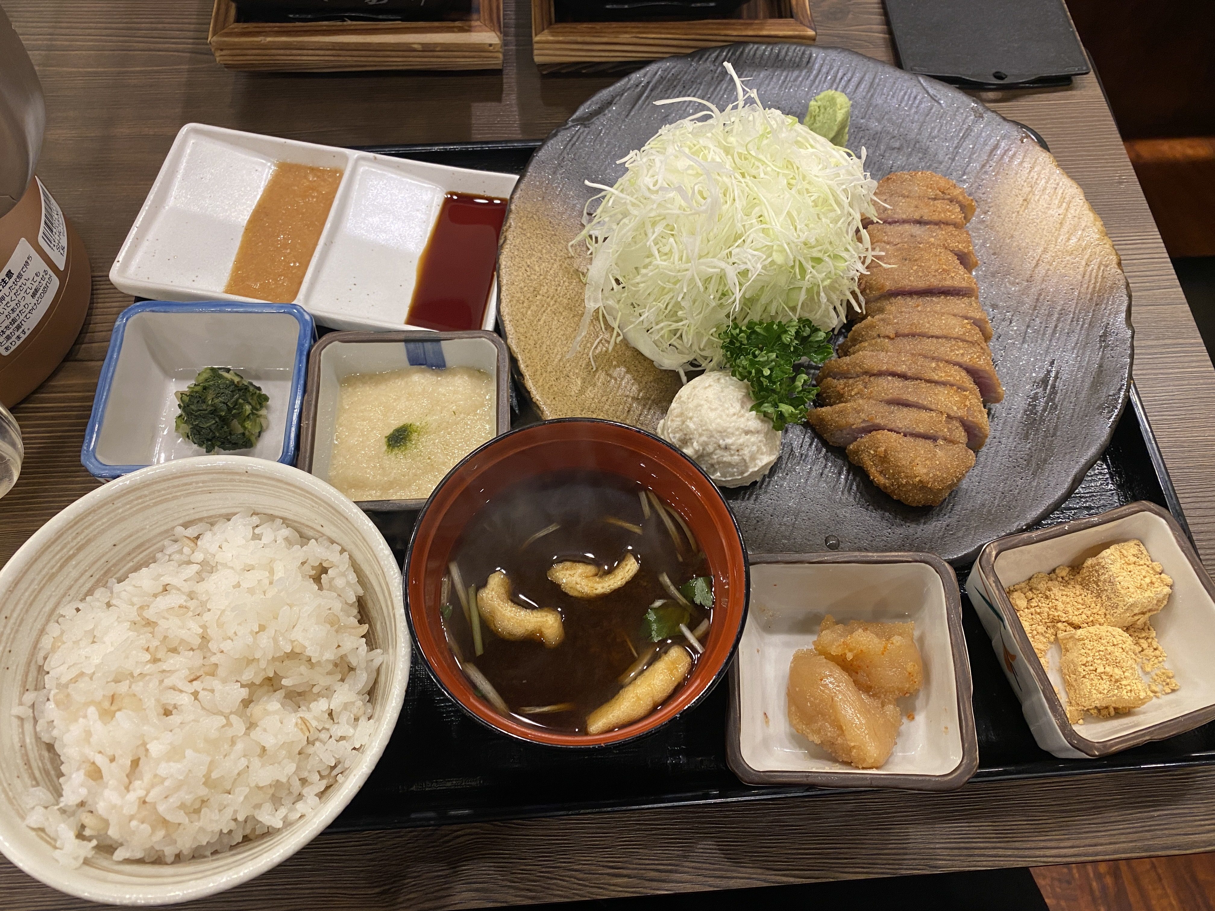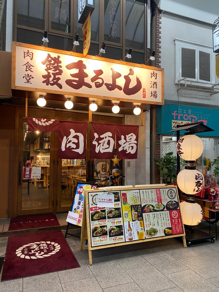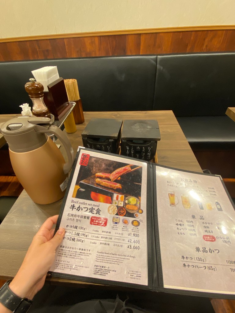 As we made our way back to central Osaka, we were already hitting 7pm. On the train we talked about what we were in the mood t0 have for dinner, and thought Gyukatsu sounded amazing! Lucky for us, an incredibly higher rated restaurant was just 3 blocks from the rail stop. We descended down the steps to the restaurant, and were seated immediately. We each ordered 1 cutlet, and anxiously waited for the delicious food to arrive. Lucky for us, the wait was not long! It seems that all Gyukatsu comes with the same sides and sauces, which was perfectly okay with us. We dug in, and mutually agreed that we enjoyed this meal better than our first one we tried in Tokyo (although David liked the sauce better from the other restaurant). With bellies full and happy, we left to make the short walk home.