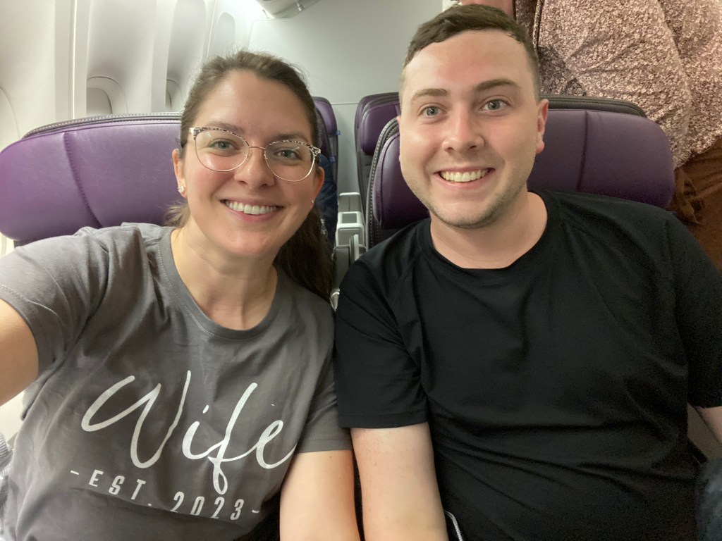 We watched the Whale (which we both thought was unexpectedly incredible) and Dune (David thought it was pretty good, Caitlyn loved it) together. We shared a veggie noodle with curry sauce and a BBQ chicken with yams and sautéed collard(???) greens for brunch. Caitlyn later had a basil tomato mozzarella sandwich for dinner and we munched on some delicious snacks throughout the flight. Neither of us slept much. Maybe 2 or 3 hrs total over multiple periods of a 14 hr flight.