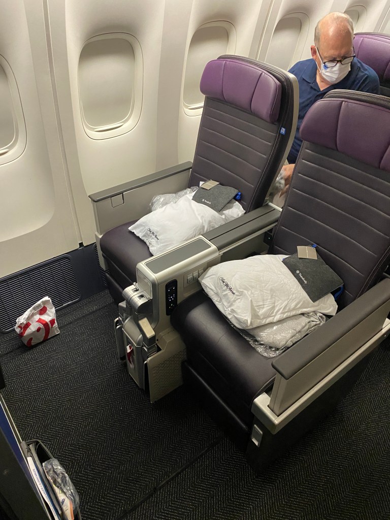 We upgraded to “premium plus” seats, which gave enough leg room for even David to kick up his legs out all of the way. The seats were huge with multiple chargers per seat, a tray, a pop-out TV, amenities like a sleep kit and free noise-cancelling headphones, and a Sachs Fifth Avenue pillow and blanket. The flight was not very crowded either and we quickly settled in for a very comfortable ride.