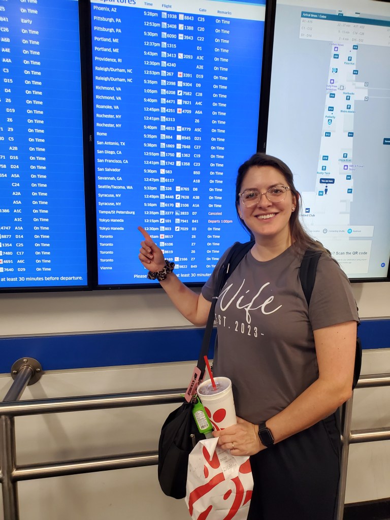 We arrived with 3 hours or so to spare. We instantly noticed that the airport was as empty as we had ever seen it! No line for check-in, baggage, or security! We got to our gate early and decided to grab a breakfast and a beer to celebrate. We settled on Chick-Fil-A because David has been really wanting to try the new spicy chicken biscuit and we grabbed a beers while we waited for our flight time.